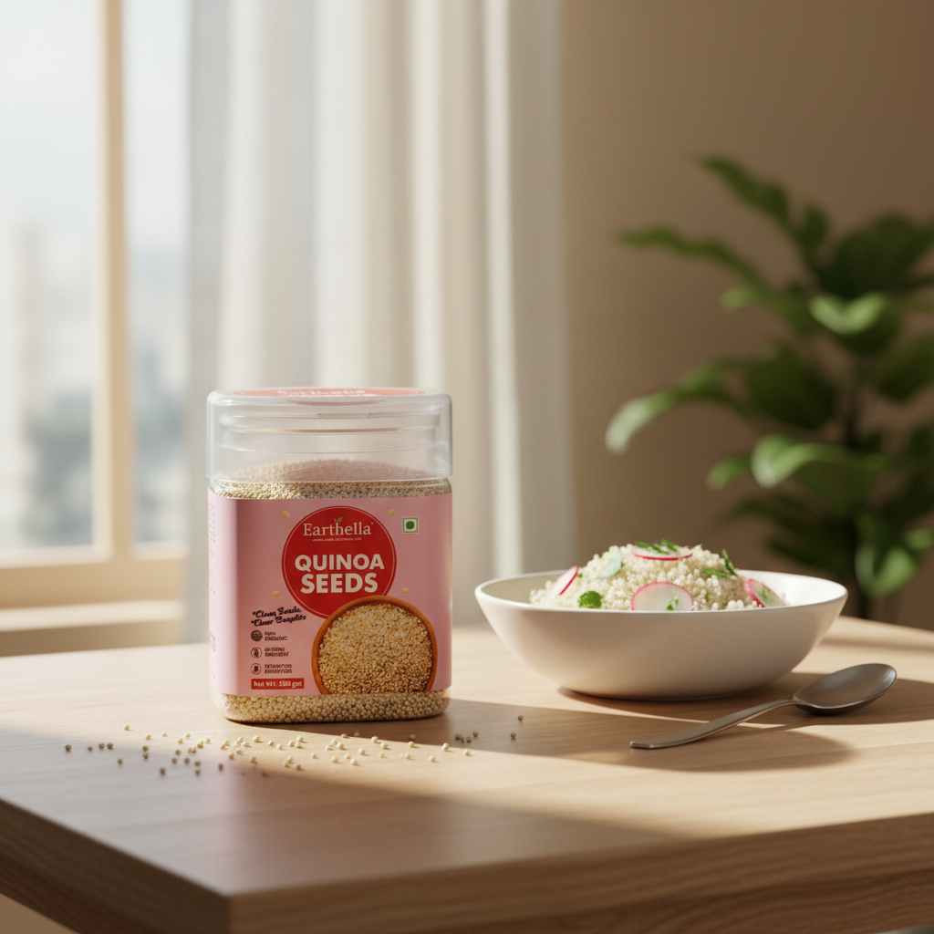 Earthella Quinoa Seeds are premium-quality, naturally grown super seeds packed with complete plant protein, fiber, and essential nutrients. Known as a superfood, quinoa supports muscle strength, digestion, and sustained energy. Ideal for everyday meals, it can be used in salads, bowls, breakfast dishes, and healthy cooking recipes.